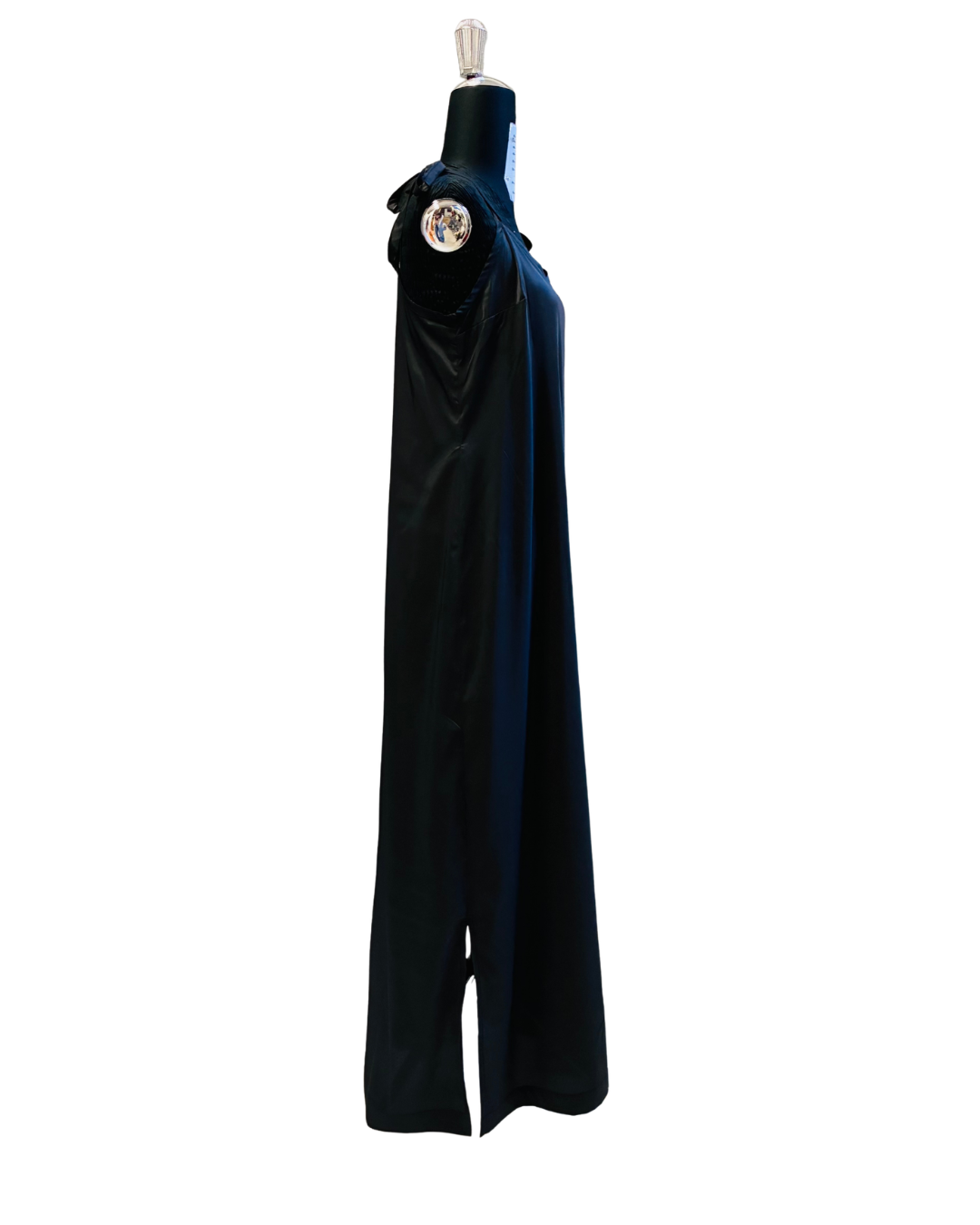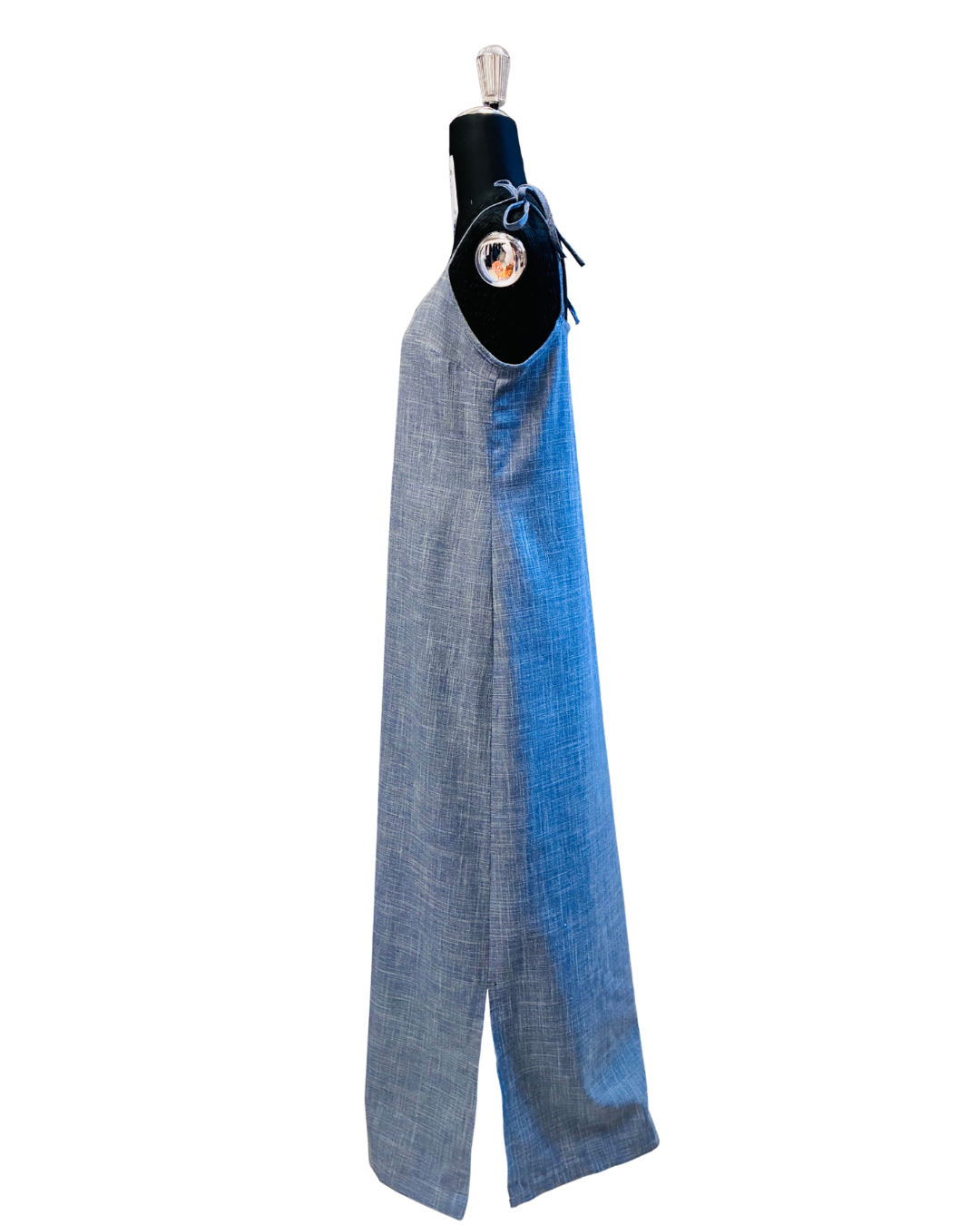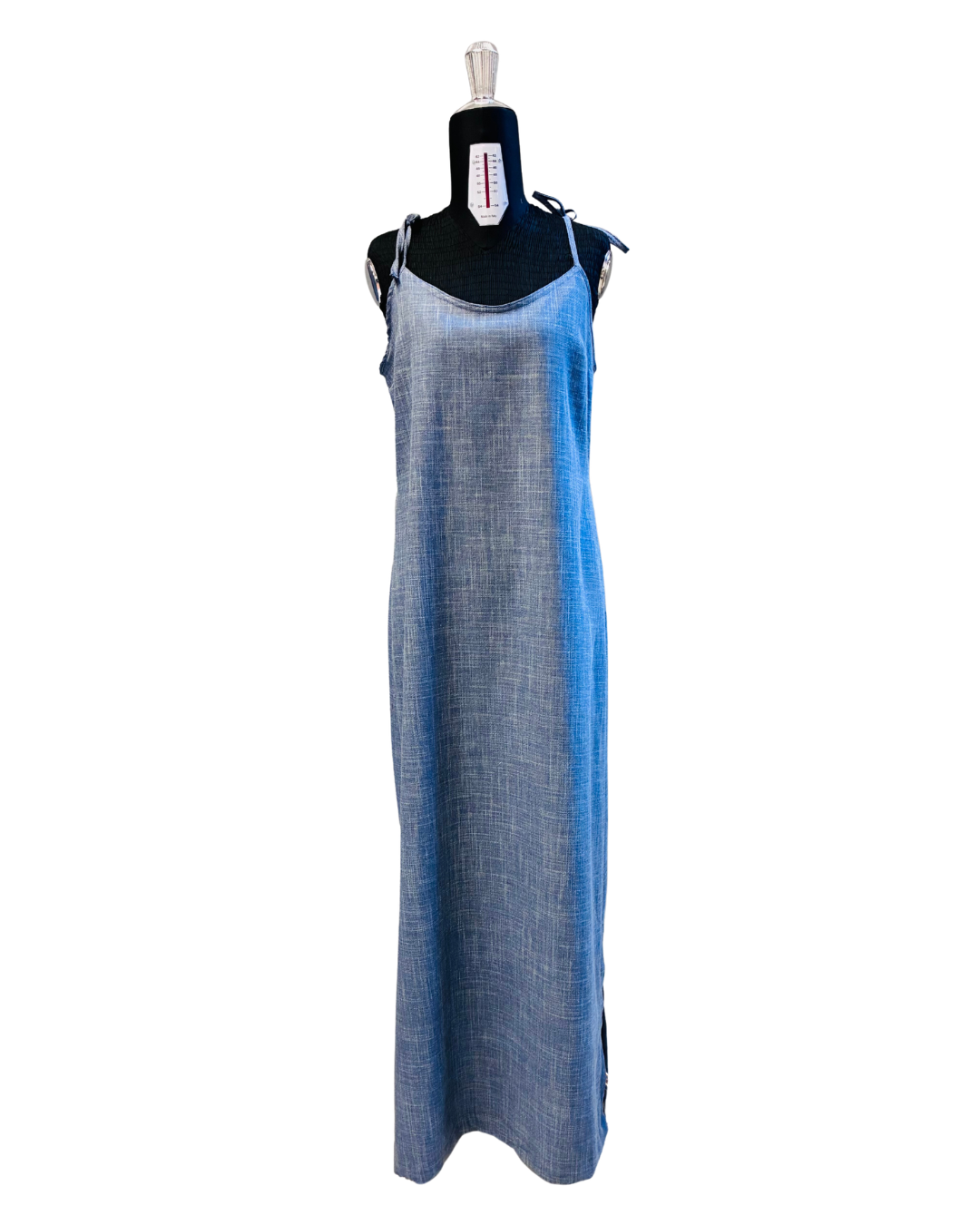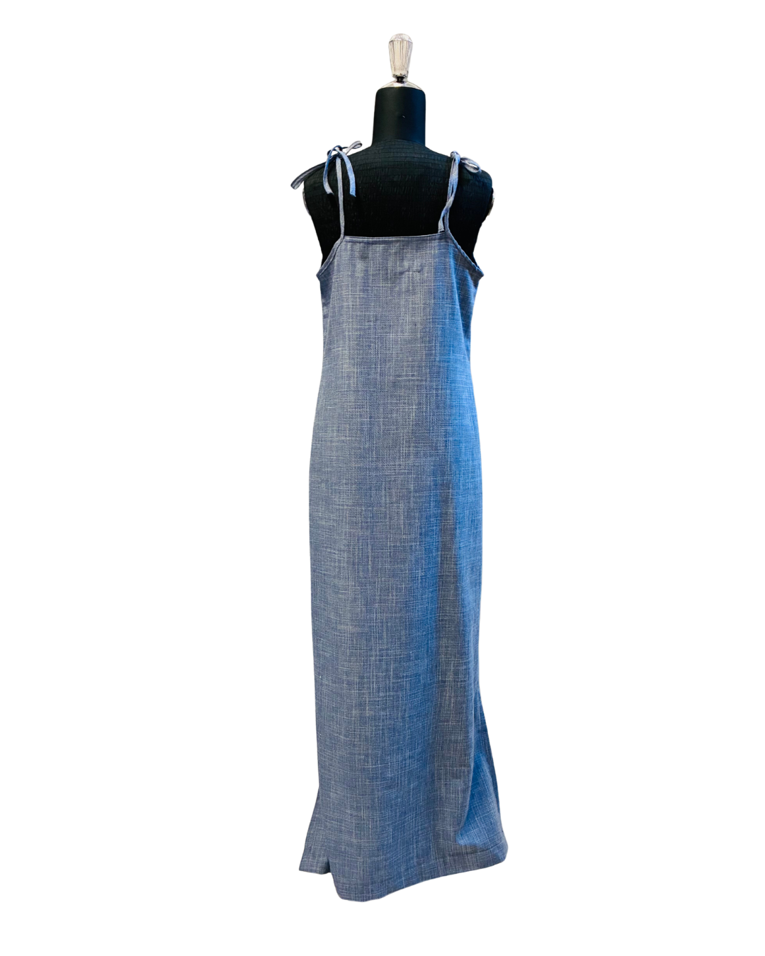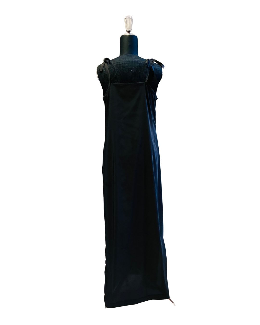 È uno slip dress che non costringe: segue il corpo, lo accarezza, lo rispetta. Il collo a V davanti slancia con grazia, mentre il dietro resta dritto e pulito; le bretelline regolabili con fiocco ti permettono di trovare l’altezza perfetta. La lunghezza fino alle caviglie e gli spacchi laterali disegnano un movimento morbido ad ogni passo, dal giorno alla sera.