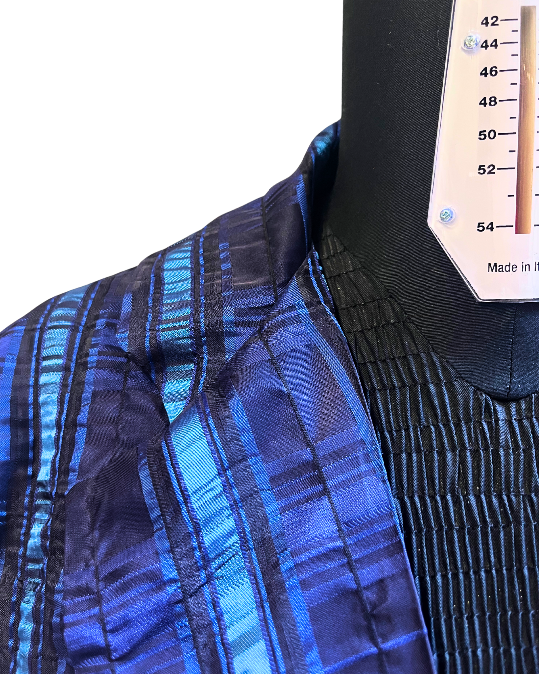 - Misure blazer - le circonferenze sono da intendersi a capo abbottonato: circ. torace 110 cm, circ. vita 101 cm, circ. fianco 104 cm. circ. muscolo 38,5 cm, Larghezza spalle 47 cm, lunghezza davanti da spalla 81 cm
