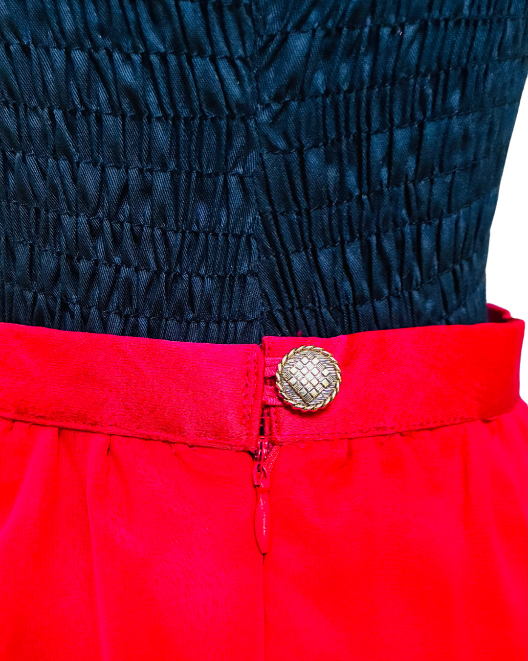 La struttura è pensata con cura sartoriale: fodera e cinturino in cady di viscosa danno stabilità e comfort in vita, mentre la chiusura resta invisibile e raffinata grazie alla zip sul fianco. A completare il tutto, un bottone gioiello: un dettaglio prezioso che non urla, ma racconta attenzione, qualità, importanza.