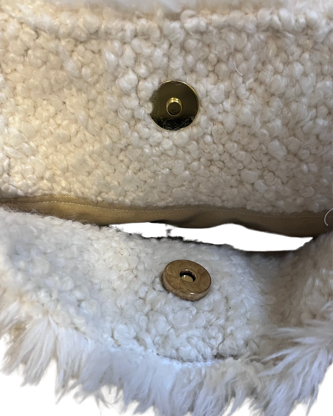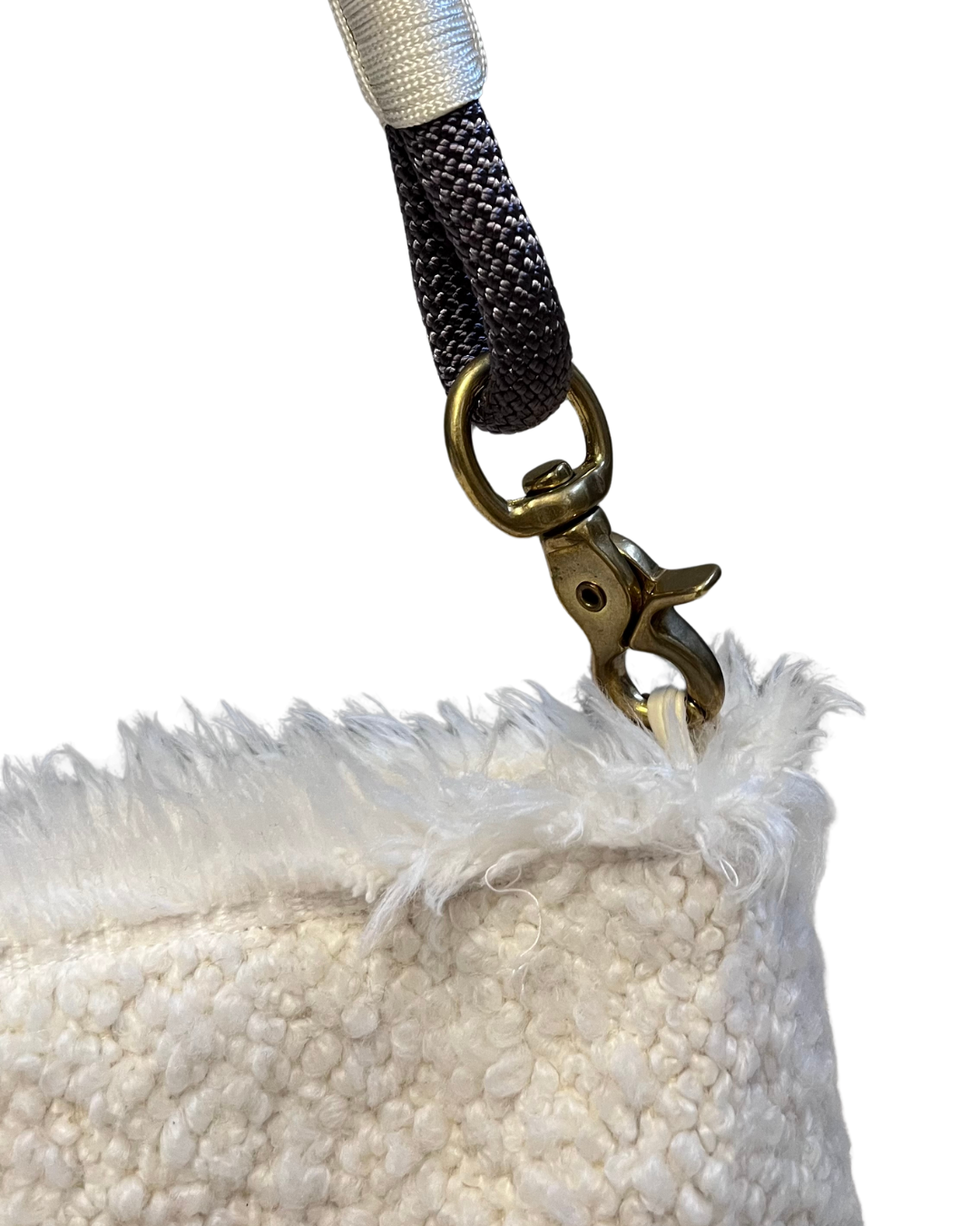 - Materiali: lana 3D bianco neve + fodera; manico upcycled (collare)