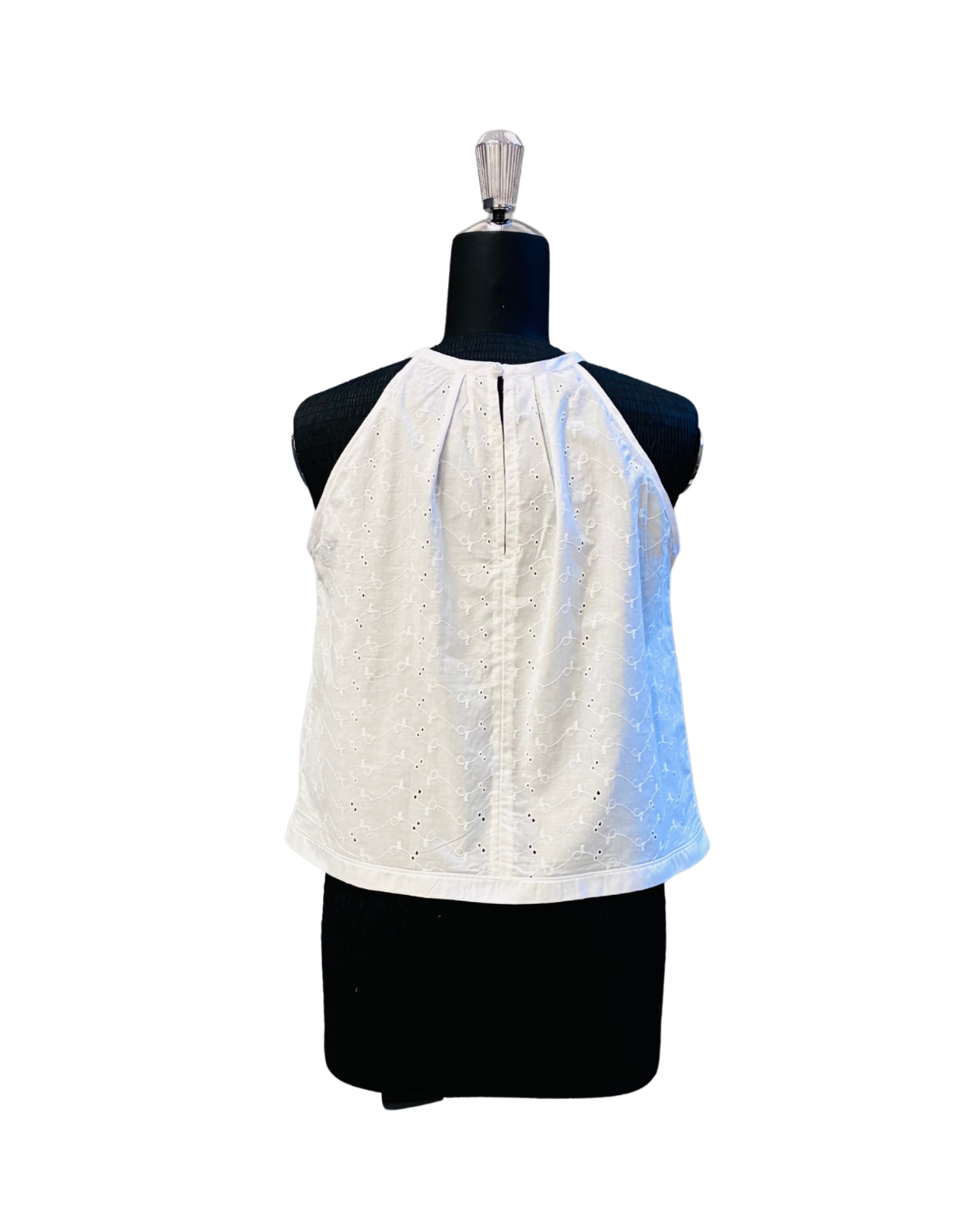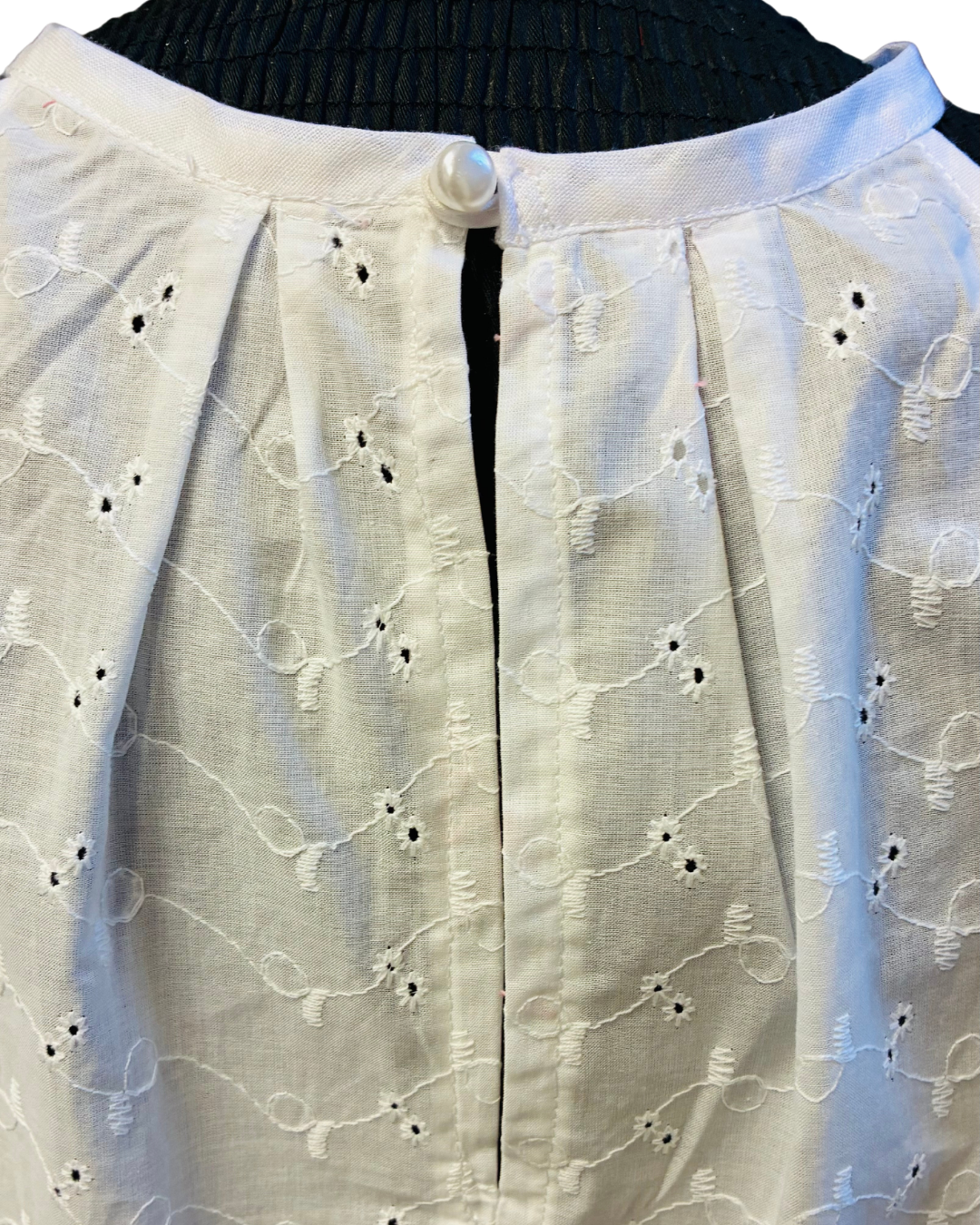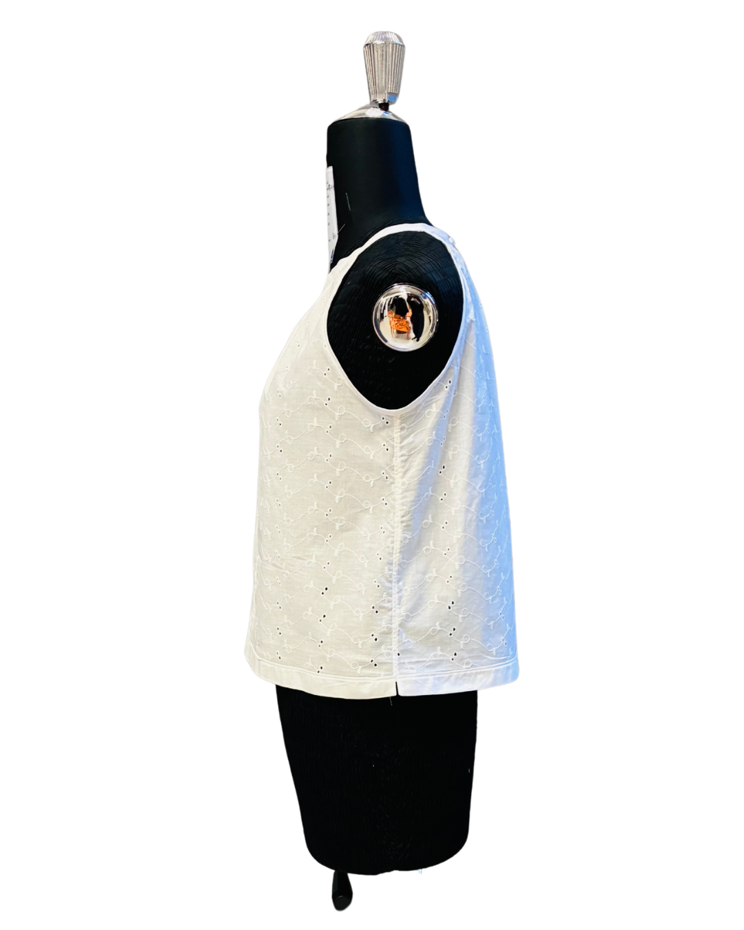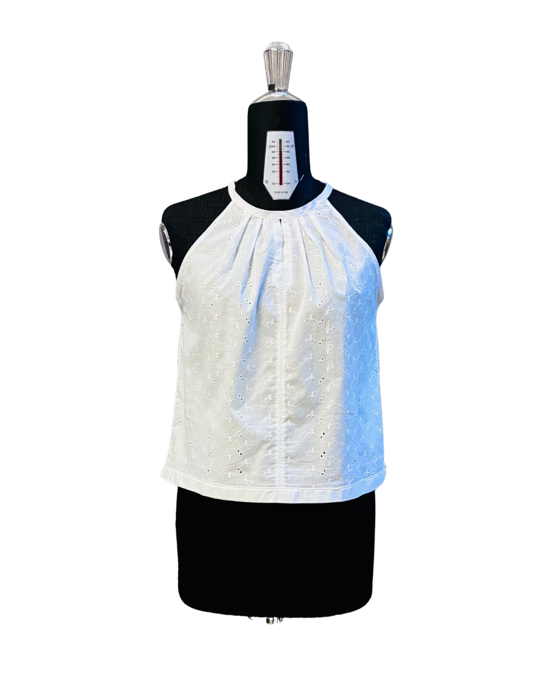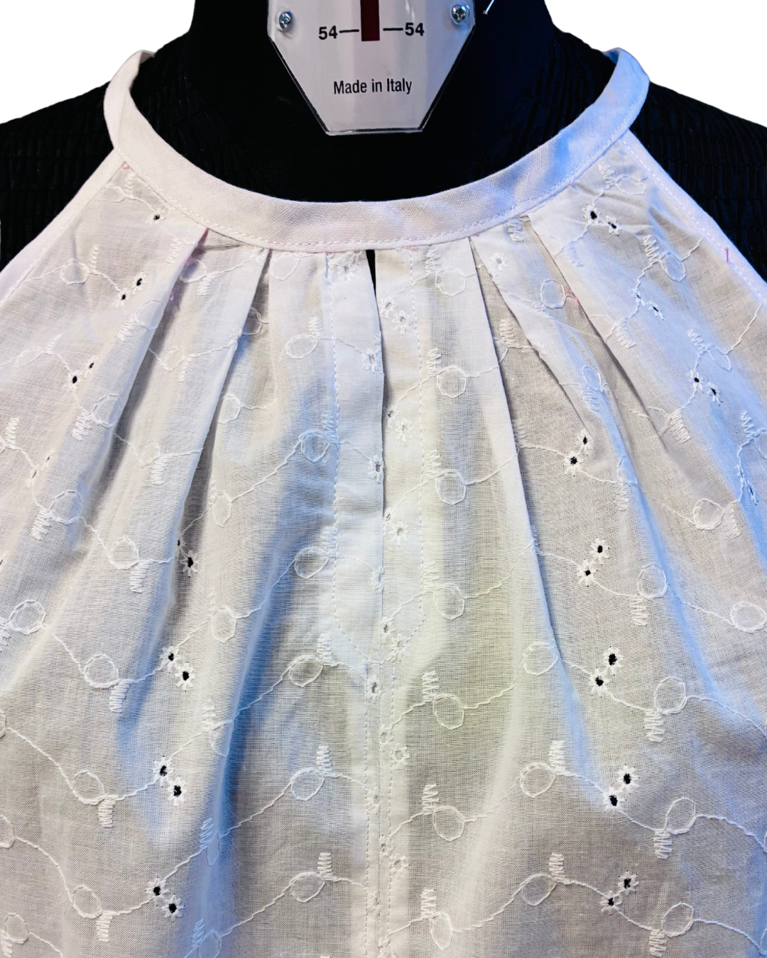 Lola è quel top che sembra semplice finché non ti avvicini. Il pizzo sangallo bianco disegna una trama delicata, luminosa, che rende speciale anche il gesto più quotidiano.