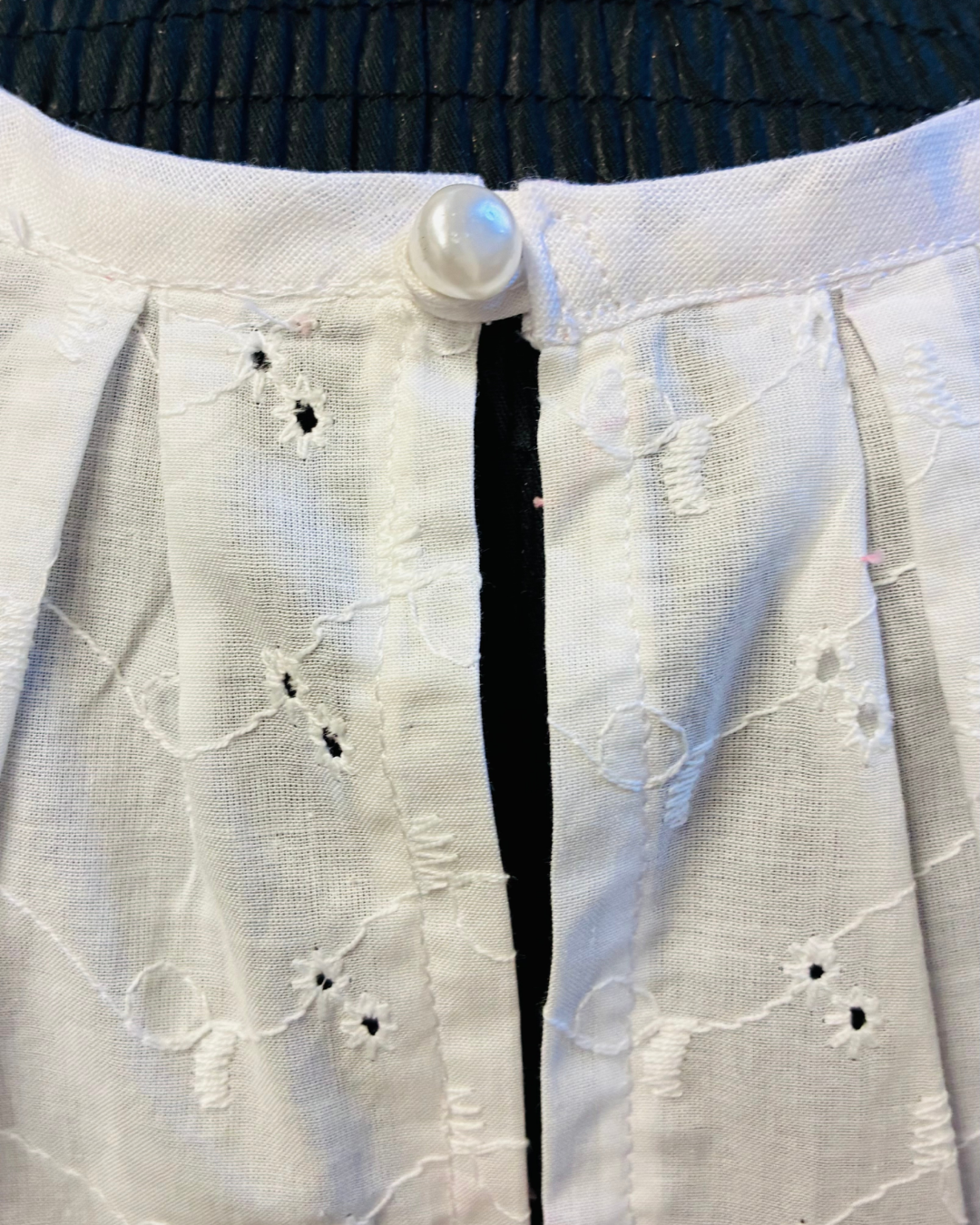 Il dettaglio che fa innamorare è sul retro: uno spacchetto centrale chiuso da un bottoncino con perla, piccolo punto luce che racconta cura sartoriale e femminilità discreta. È il tipo di particolare che non si nota subito, ma resta impresso — perché in ddLab la bellezza vive anche nei dettagli.